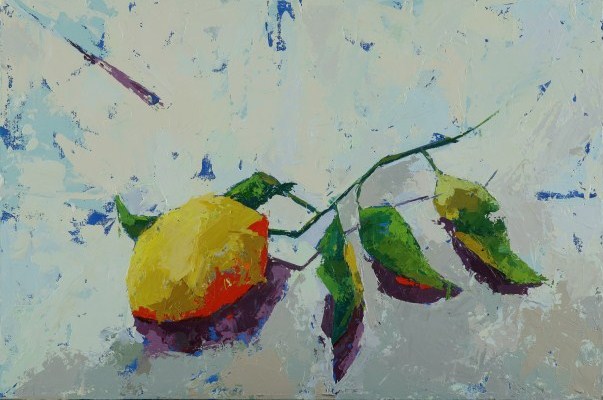 Completed in just under an hour, this 10 x 10 oil on canvas study of a lemon is a more expressive, playful piece. Revisiting my pop-art roots of pin striping a canvas and overlaying an image, I applied this process to my thesis subjects of fruits & vegetables.